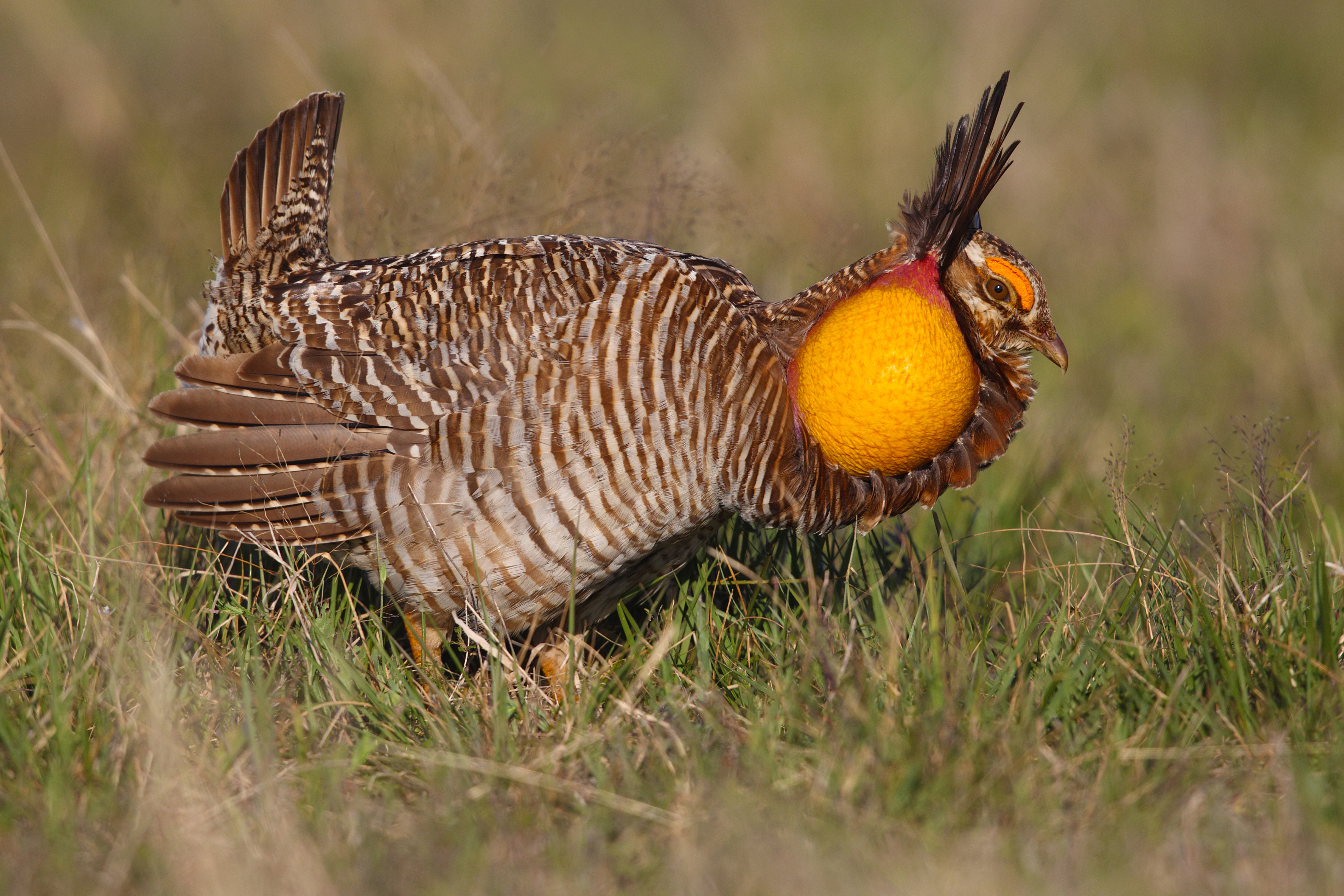 This small grouse is a highly endangered subspecies of the greater prairie chicken, native to Texas’ coastal prairies. Males have large orange air sacs on the sides of their necks, which they inflate during mating season to make a loud "booming” sound.