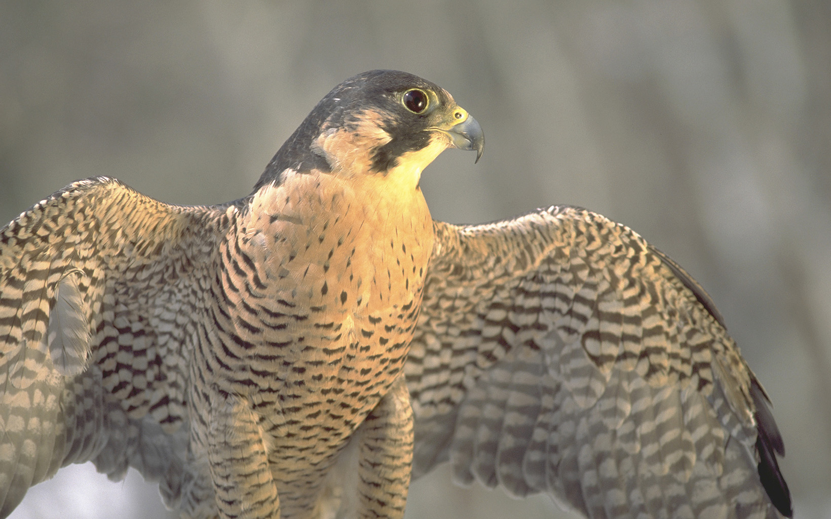 The peregrine falcon is a crow-sized bird that can be found on every continent except Antarctica, making it one of the most widely distributed raptors in the world. It catches its prey—mainly small birds—in midair after diving from great heights. During these dives, a peregrine falcon may reach speeds of more than 200 mph, making it the fastest animal on the planet.
