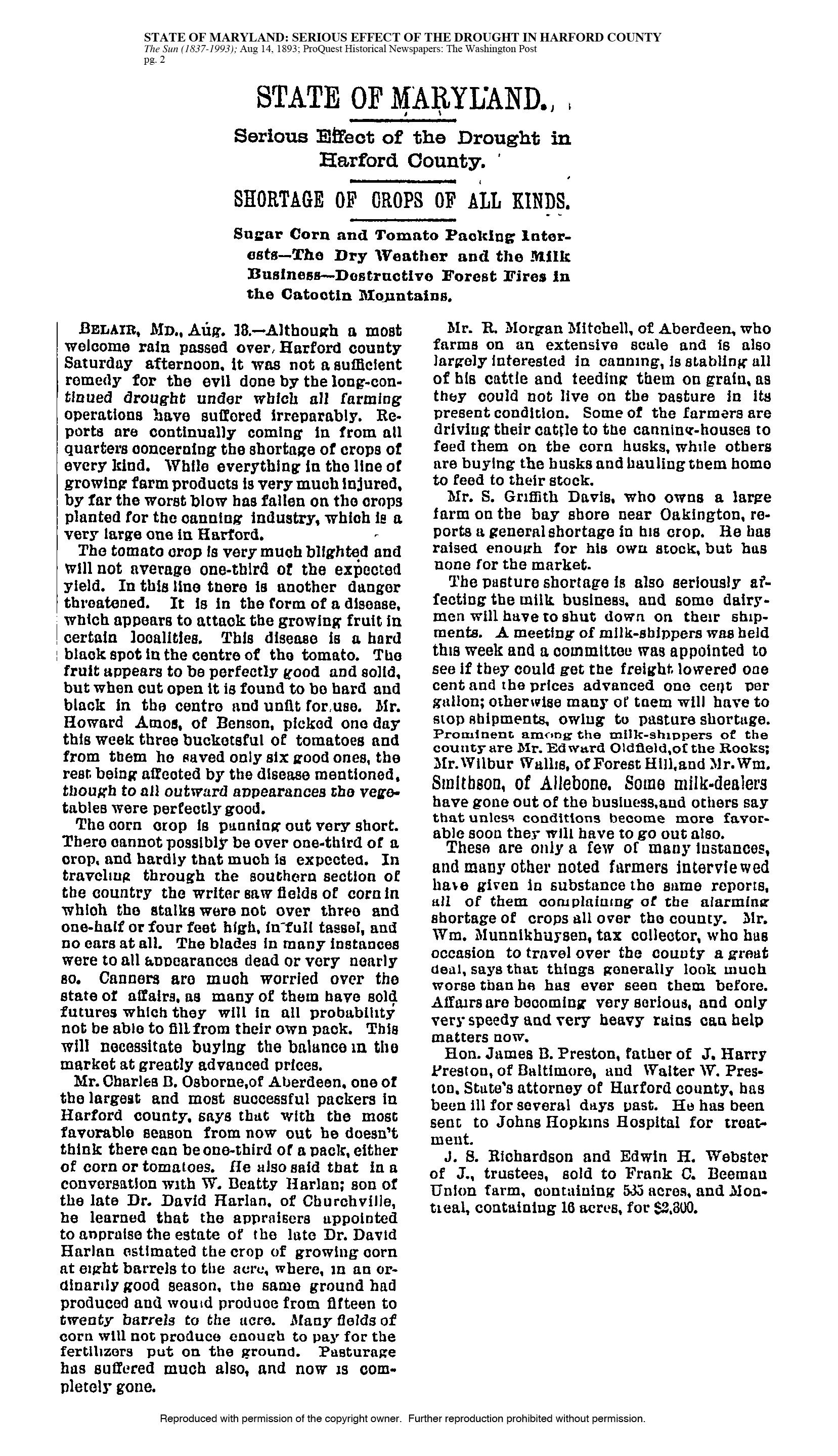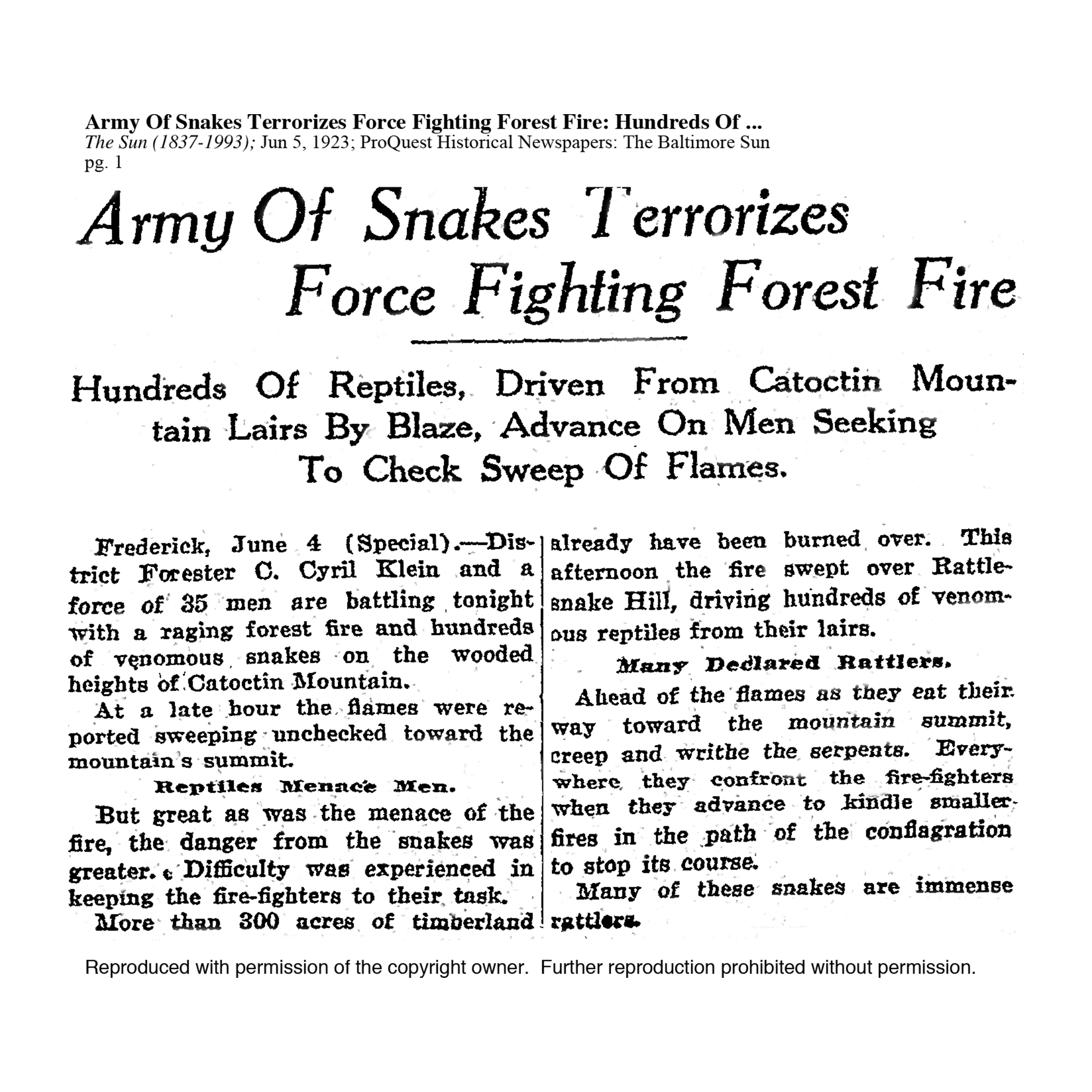 On May 17, 1923, the Catoctin Clarion reported on the efforts of the State Forestry Association to prevent what it described as "incendiary firing" of the forests on South and Catoctin Mountains. The article goes on to attribute these fires to berry pickers.