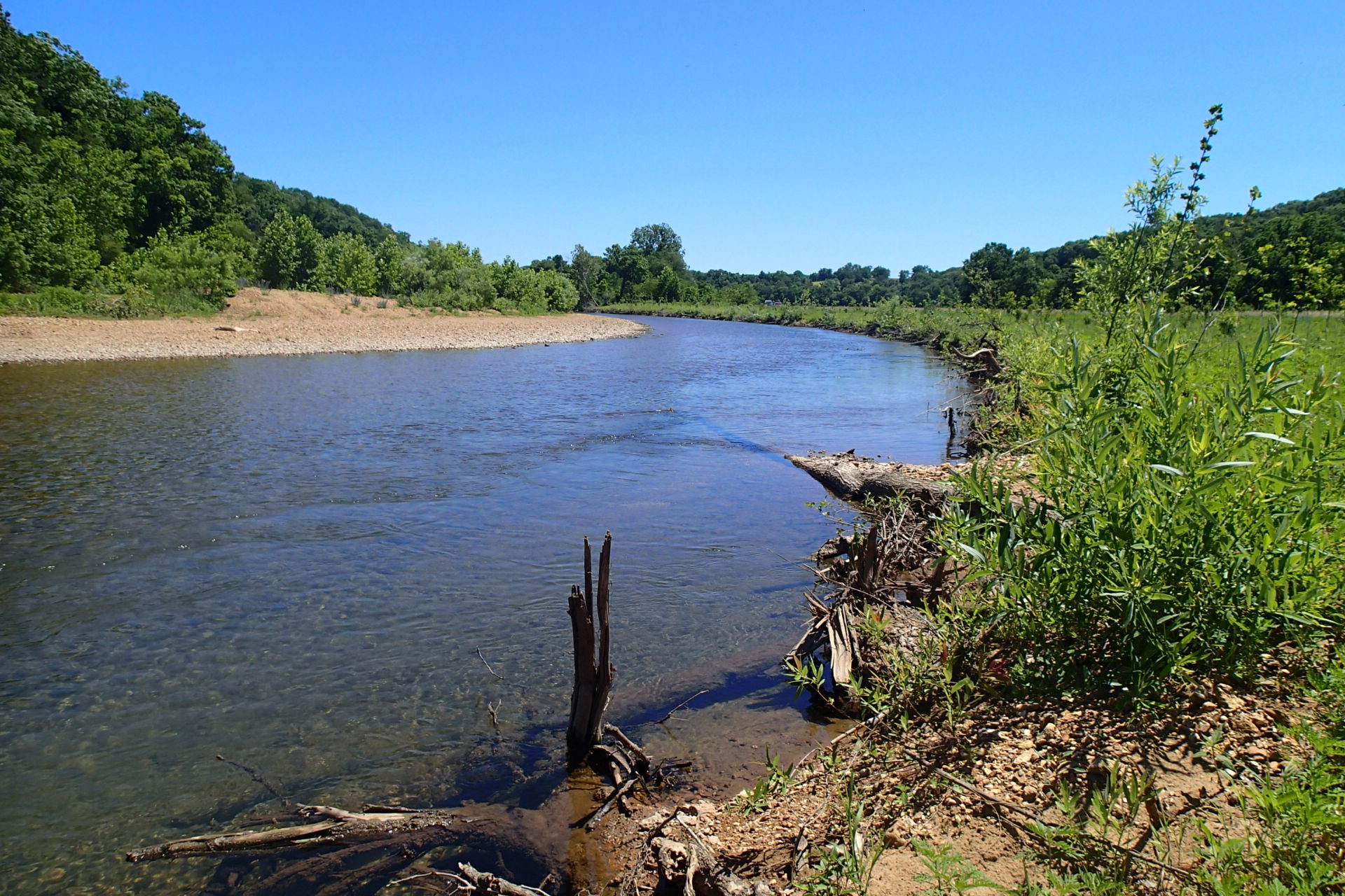 At this site, TNC worked with the Missouri Dept. of Conservation, Ozark Land Trust and a landowner to stabilize nearly 2,000 feet of eroding streambank by implementing bioengineering techniques to stop the erosion, enhance habitat for fish and wildlife and keep private land from washing away.