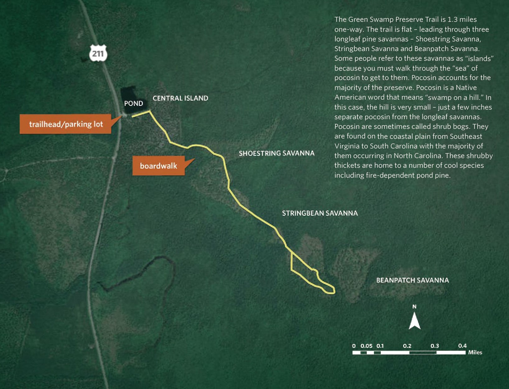 The Green Swamp Preserve contains some of the country’s finest examples of a healthy longleaf pine savanna managed with controlled burning. The trail is 1.3 miles one-way (2.6 miles in total) and 2-3 feet wide. The trail is mostly flat, with no significant steep slopes. The walking surface is uneven with dirt, grasses, inundated water and exposed roots; we advise wearing closed-toed shoes. The route is marked with red diamonds on the trees, and it starts at the parking lot area (trailhead), where you will see a pond and continue through a pine savanna until you reach a boardwalk. After crossing the boardwalk, you will hike through Shoestring Savanna, Stringbean Savanna and Beanpatch Savanna—where you will turn around and walk back. Always follow the red diamonds on the trees. Download the trail map before you visit.