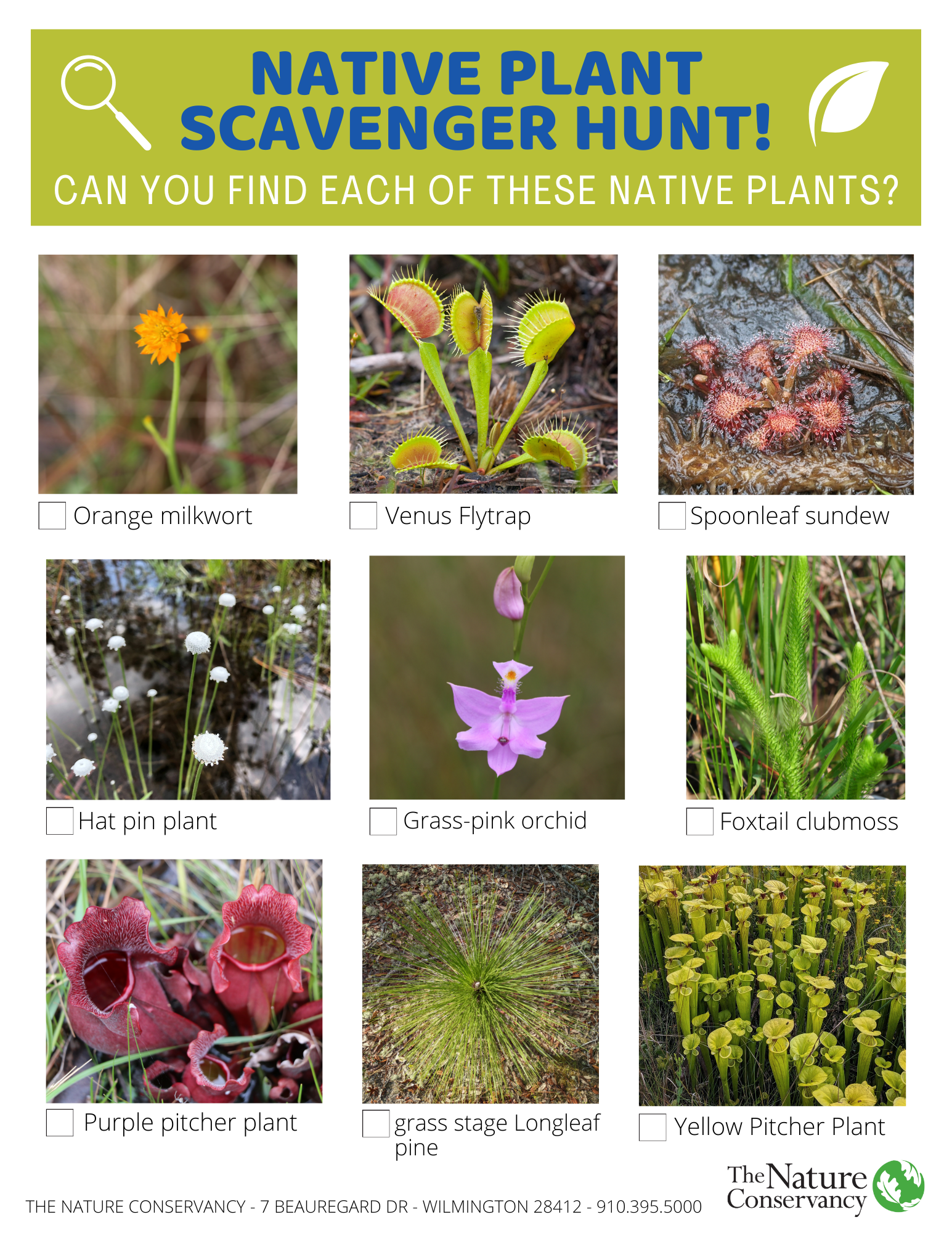 Longleaf pine savannas are open and clear, so all the sunlight comes in—please use sunscreen and use sunglasses to protect your eyes. The preserve is open to hunters during hunting season; you may hear the sound of gunfire during this time. Keep in mind that there are no resting benches along the trail or restrooms on site.