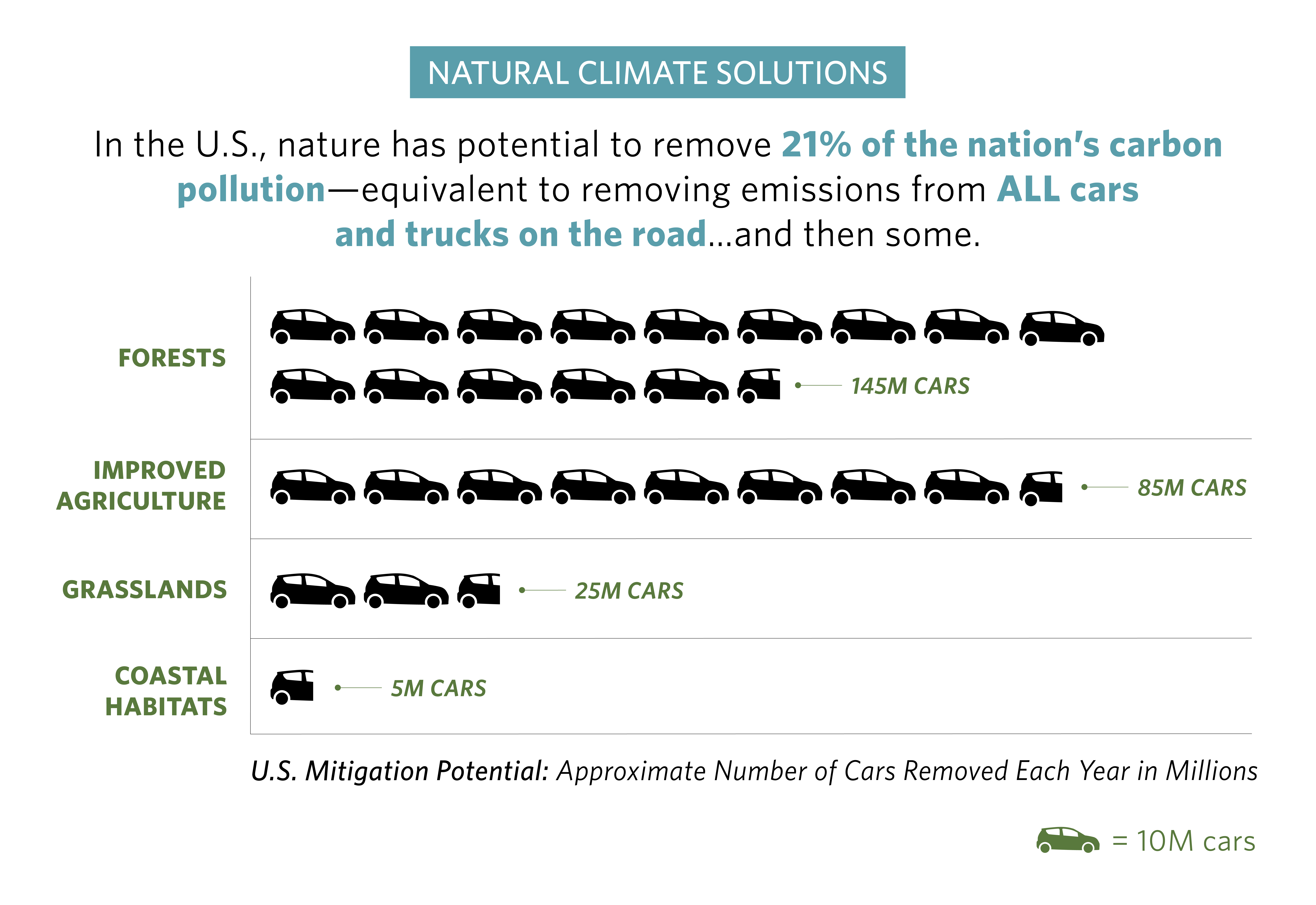 The U.S. study shows that if all 21 pathways were implemented to their full potential, they could prevent or sequester more than one-fifth of annual U.S. greenhouse gas pollution—the equivalent of removing the emissions from all U.S. cars and trucks from the road. Or, to frame it another away, the equivalent of the entire annual emissions from Brazil.
