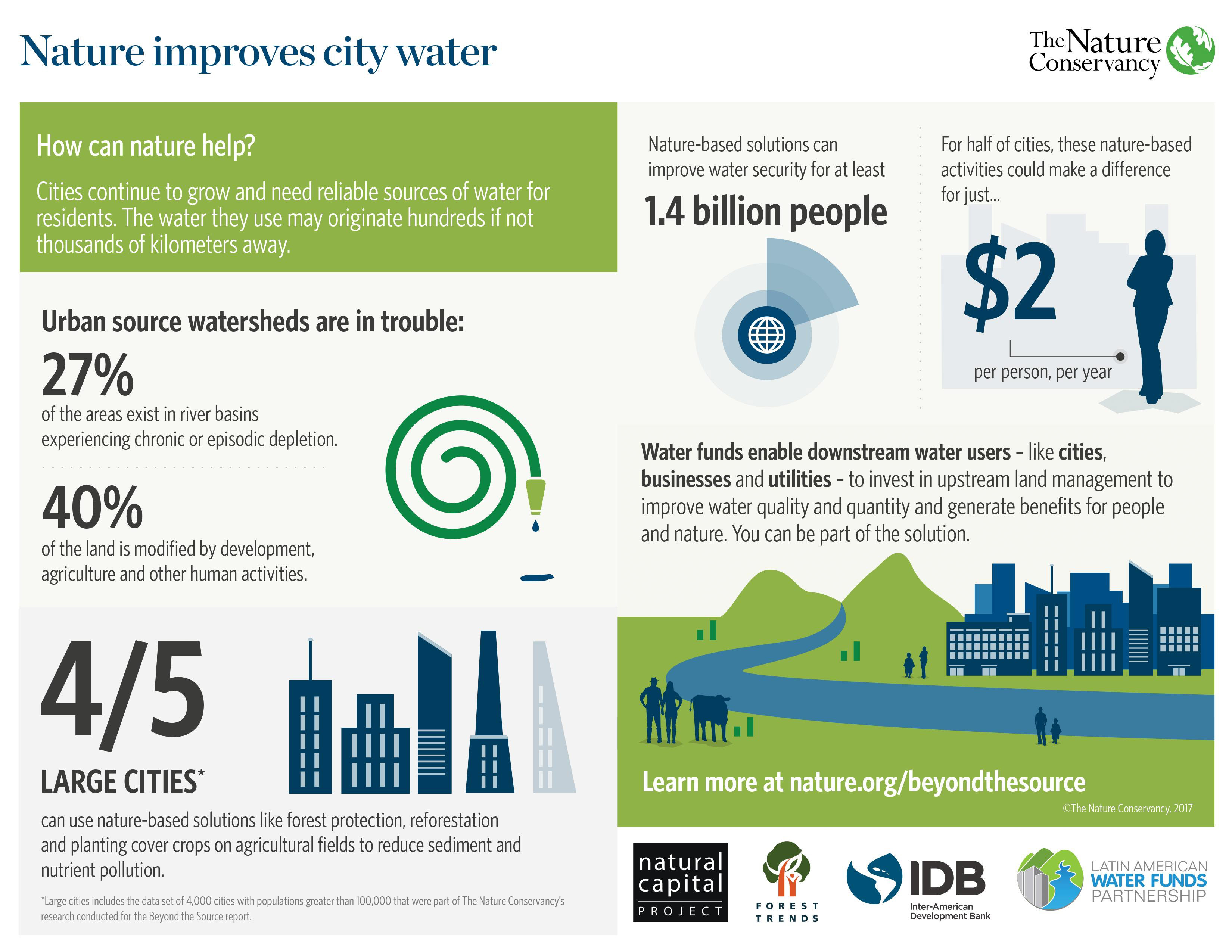 In fact, for half of the cities that the Conservancy studied, such a mechanism could fund source water protection activities at a cost of just US$2 or less per person per year.