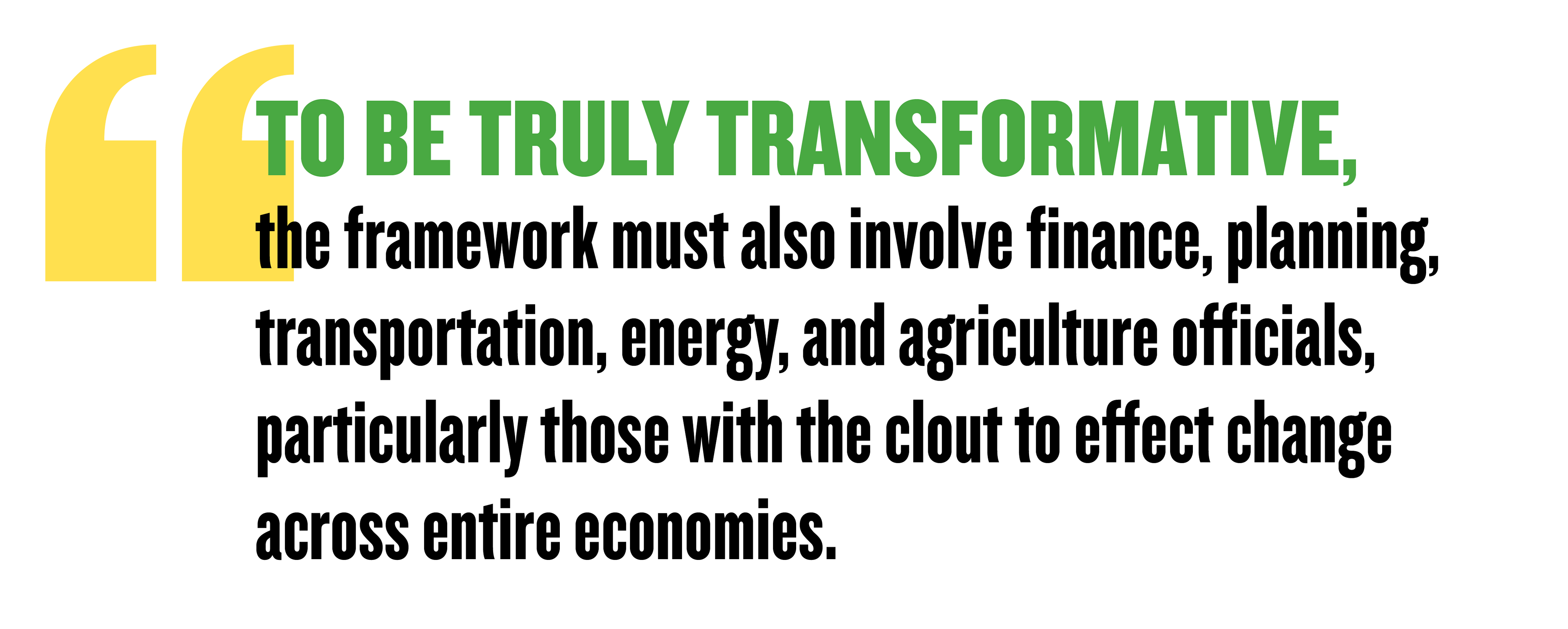 Responsibility for protecting the natural world has traditionally fallen to environment ministries, park managers, and conservationists, all of whom will be at the negotiating table next year. But to be truly transformational, the post-2020 Global Biodiversity Framework must also involve finance, planning, transportation, energy, and agriculture officials, particularly those with the clout to effect change across entire economies.