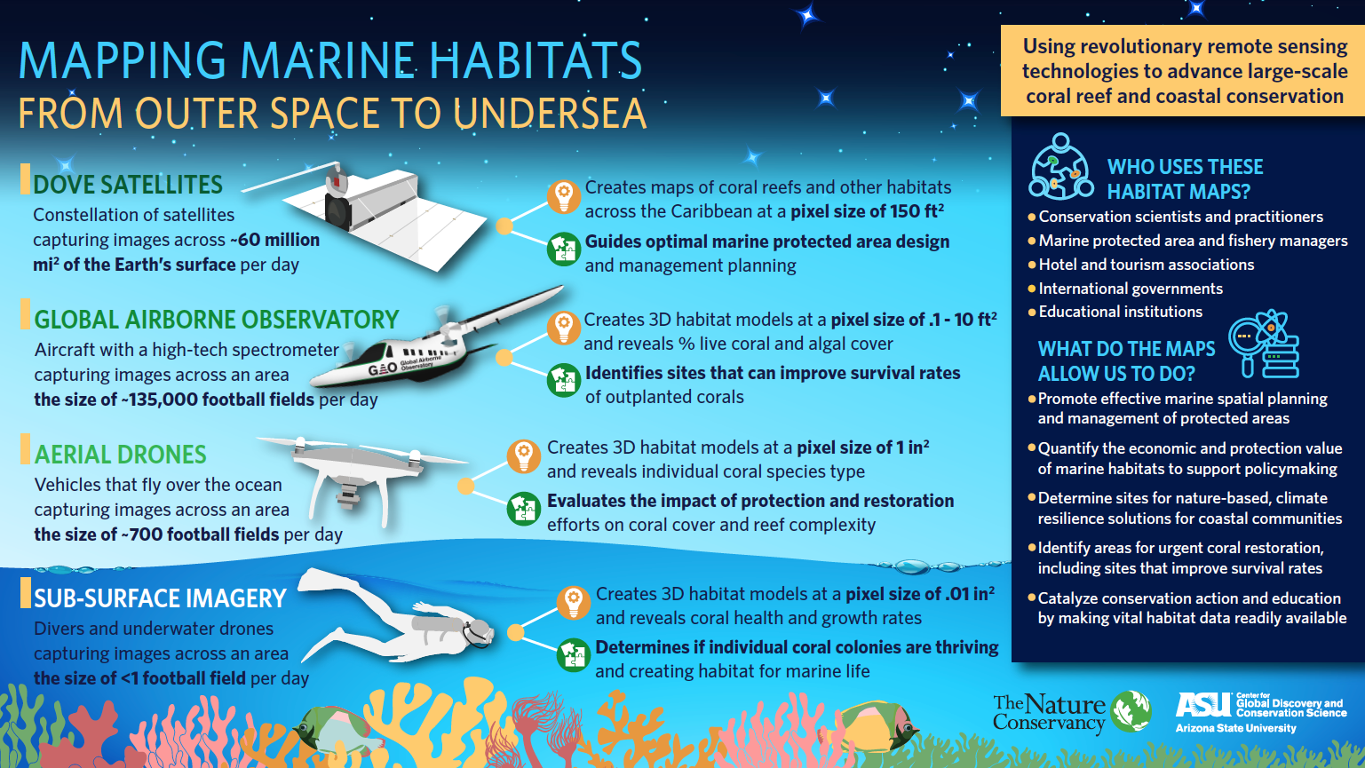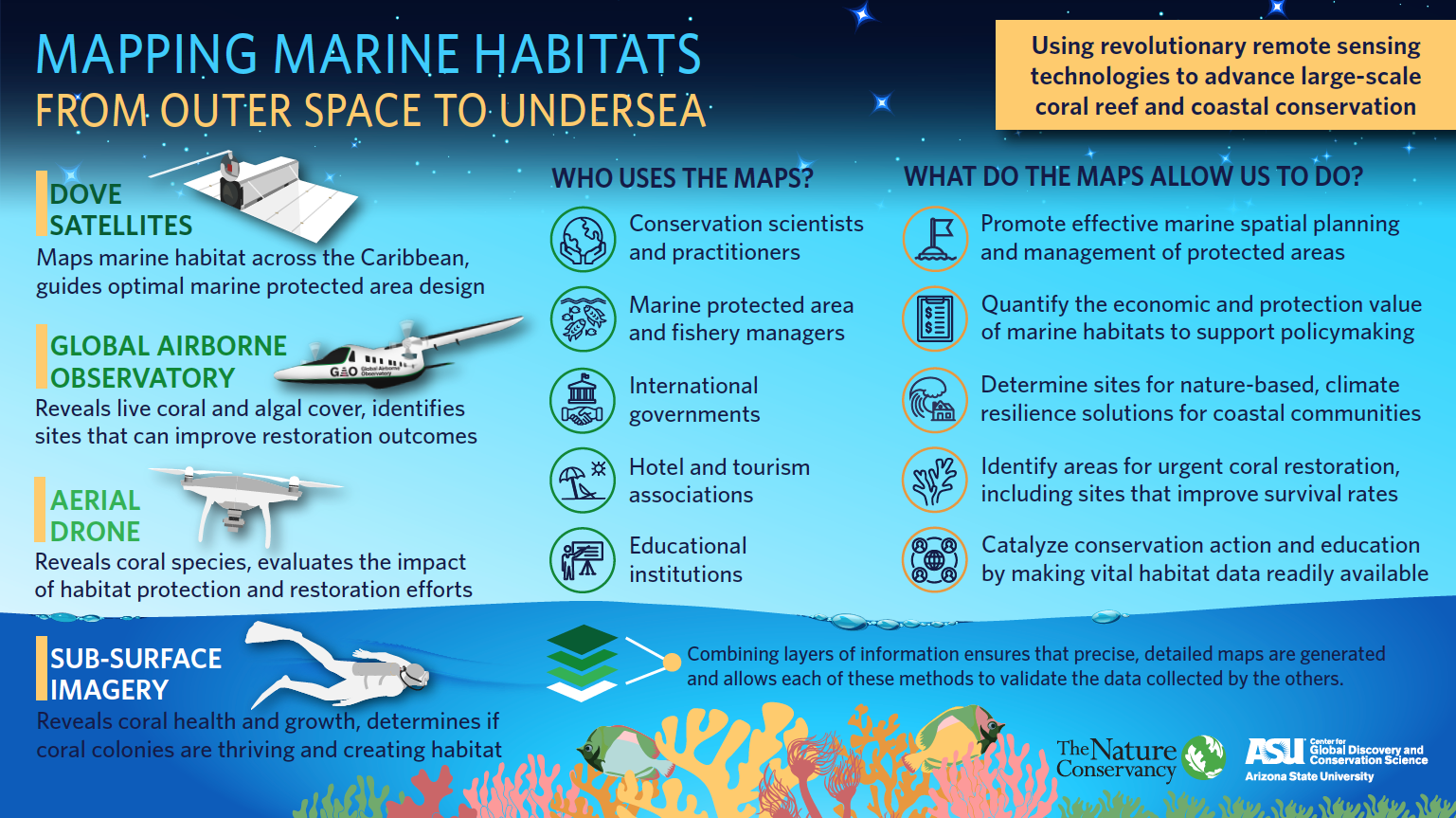 Infographics: Mapping Marine HabitatsFrom Outer Space to Undersea: Using revolutionary remote sensing technology to advance large-scale coral reef and coastal conservation
